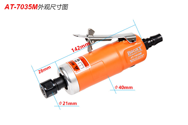 • 產(chǎn)品參數(shù): 夾頭能力:標配M6 (可選配M3) 空載轉(zhuǎn)速:22000rpm 全 長:142mm 重 量 : 0.54kg 耗 氣 量:0.45m3/min 【專業(yè)型/前排氣】