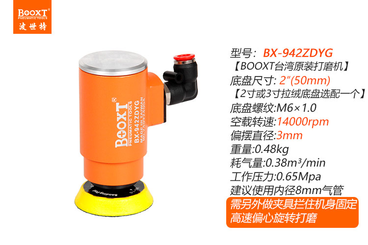 • 產(chǎn)品參數(shù): 底盤尺寸:50mm(2寸) 偏擺直徑:3mm 【可定制細(xì)磨1.5mm或0.75mm】 空載轉(zhuǎn)速:14000rpm 重 量:0.48kg 耗 氣 量:0.38m3/min 【工業(yè)型】